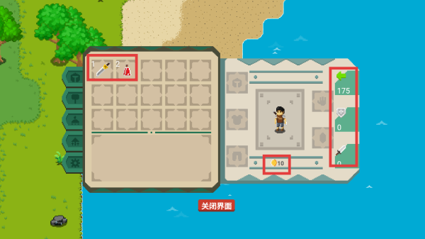 3、熟悉背包界面,了解物品栏布局,关注角色状态条(如生命值175等)和金币数量(10金币),合理管理资源。