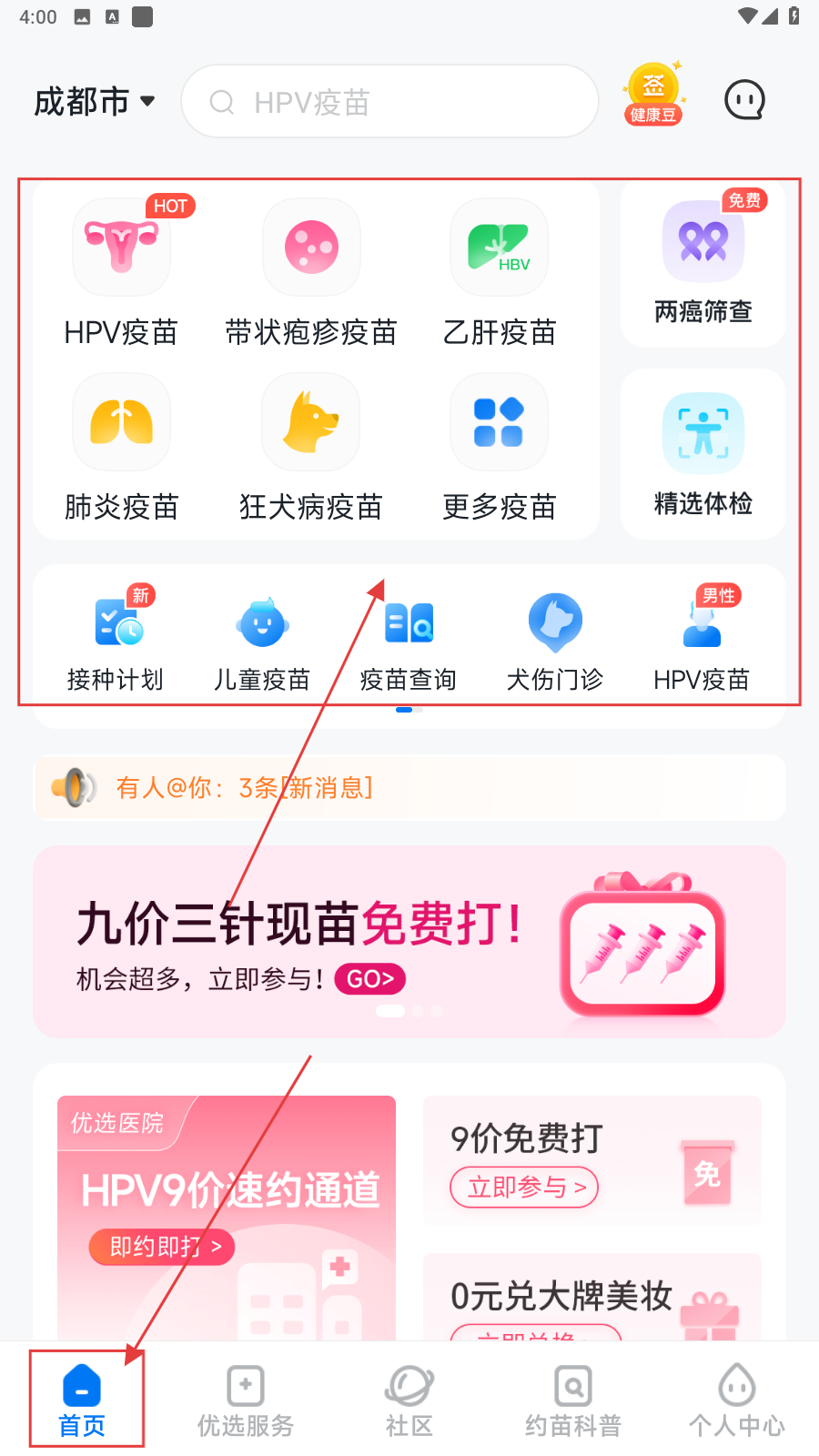 1、打开疫苗预约类应用,进入【首页】,在疫苗分类区域点击【HPV疫苗】。