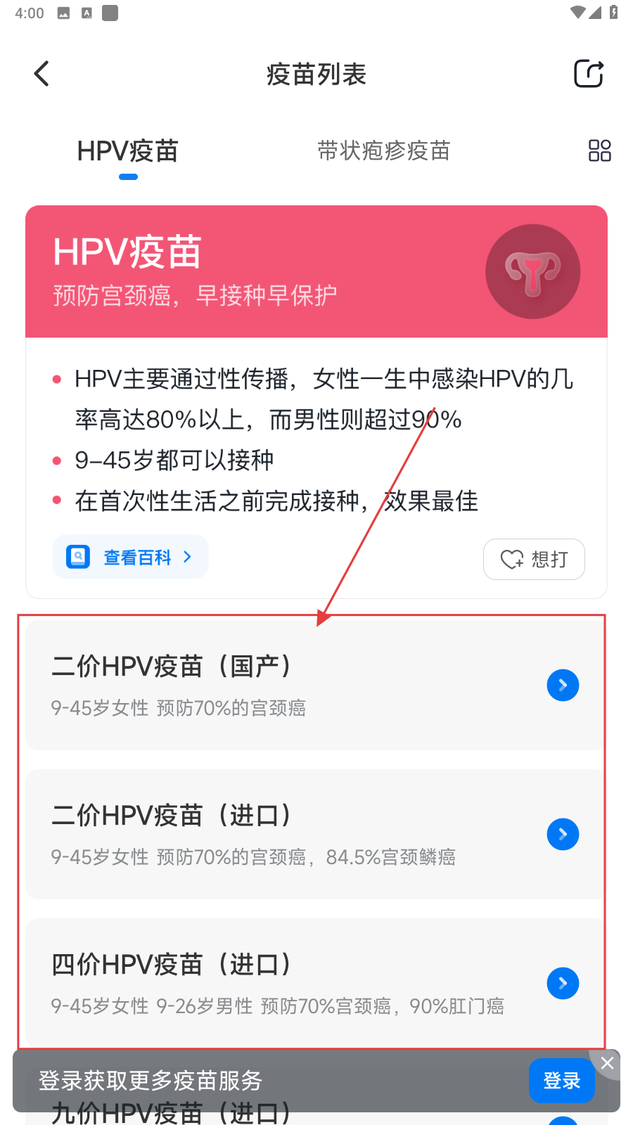2、在HPV疫苗列表中,查看不同类型HPV疫苗信息,如【二价HPV疫苗(国产)】,了解适用人群及预防病症等内容。