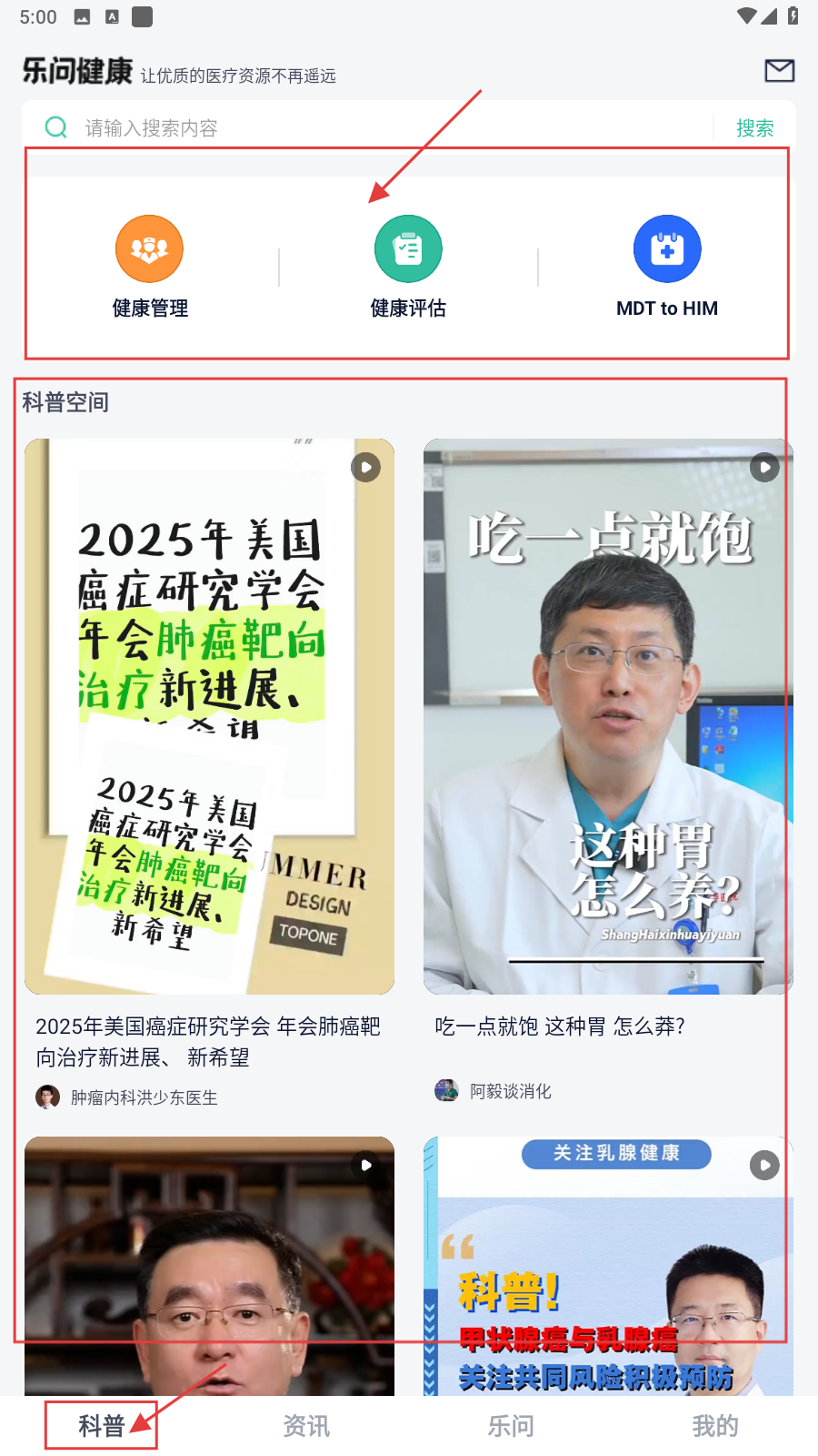 1、打开应用,在【科普】板块,可点击“健康管理”“健康评估”等功能选项进行健康相关操作。