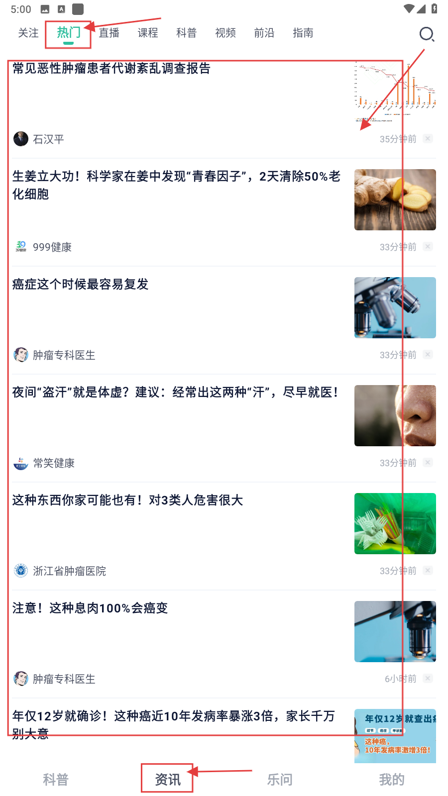2、切换到【资讯】板块,在“热门”分类下浏览热门医疗资讯文章,如“常见恶性肿瘤患者代谢紊乱调查报告”等,了解行业动态。