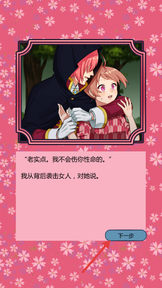 2、在剧情对话界面,阅读文字内容(如“老实点。我不会伤你性命的。”),点击【下一步】推进故事,了解角色关系和任务。