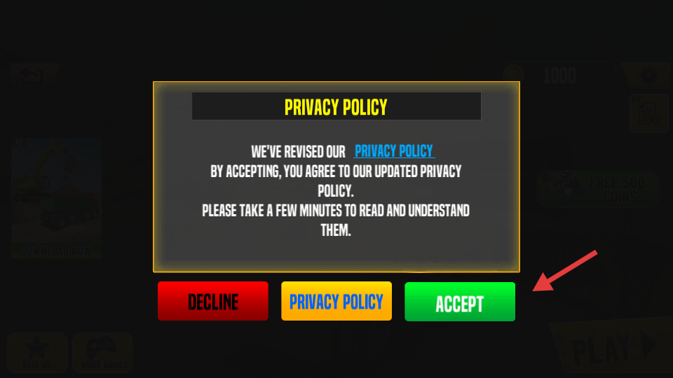 3、遇到【PRIVACY-POLICY】弹窗,点击绿色【ACCEPT】同意政策,开启游戏后续内容,避免因拒绝影响体验。