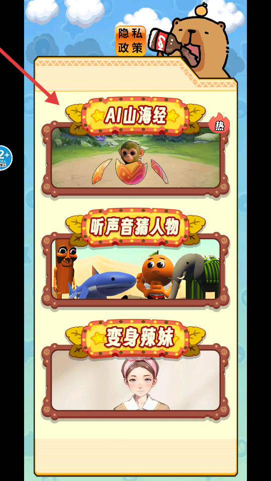 2、在游戏选择页,选择【AI山海经】【听声音猜人物】或【变身辣妹】等模式,体验不同玩法,开启趣味挑战。