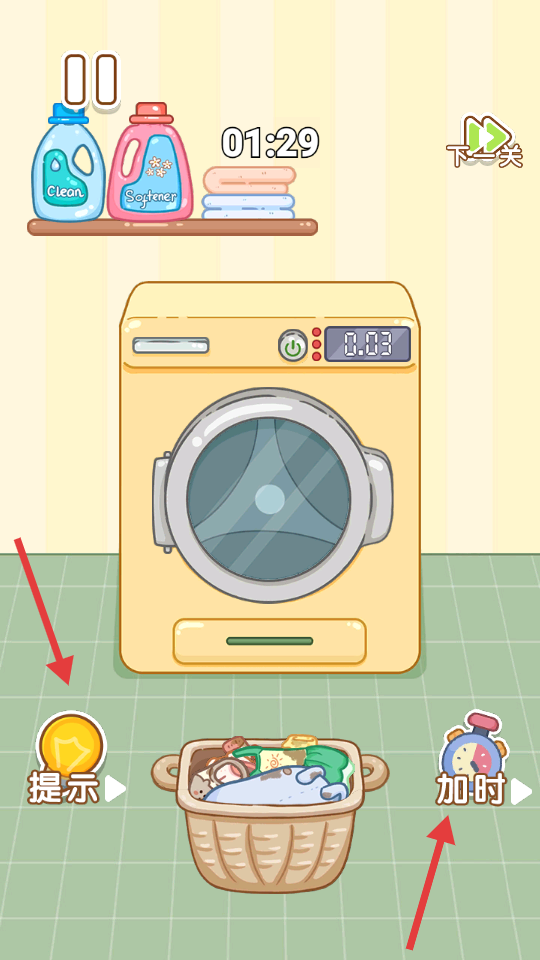 3、在洗衣关卡,借助【提示】和【加时】,在限时内处理衣物,完成收纳操作,顺利通关。