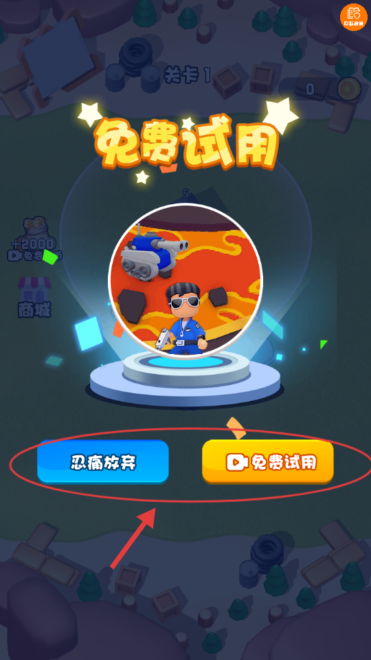 3、面对【免费试用】,可选择观看广告试用新角色,或点击【忍痛放弃】继续原有角色,根据需求选择。