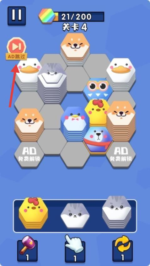 1、在【关卡-4】,匹配底部动物块到上方六边形网格,消除相同图案,积累进度21/200,用AD跳过解锁新块,快速通关。