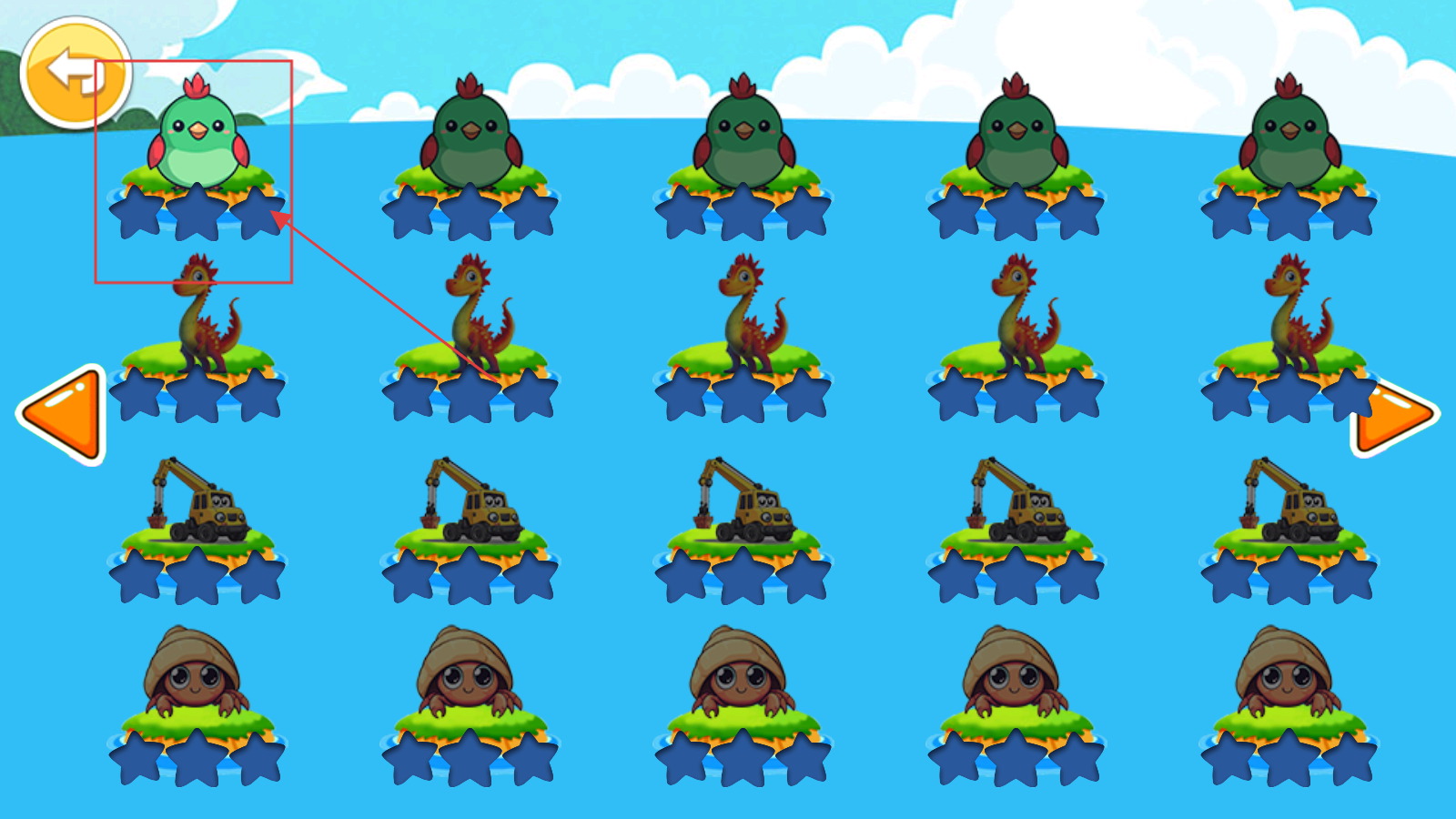 1、打开应用,在关卡选择页,点击小鸟图标,进入对应动物主题关卡。