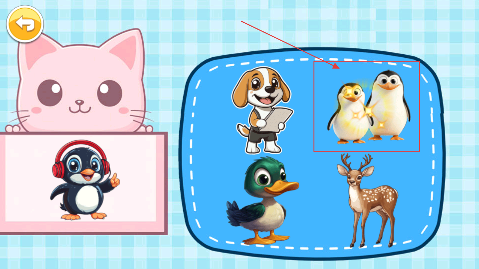 2、进入关卡,根据左侧【戴耳机企鹅】提示,在右侧蓝色区域找到匹配的【企鹅】。
