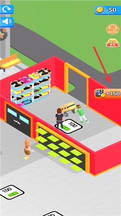 2、进入鞋店场景,与角色互动完成任务,获取【+150】金币,用于解锁新店铺或升级设施,扩大经营。