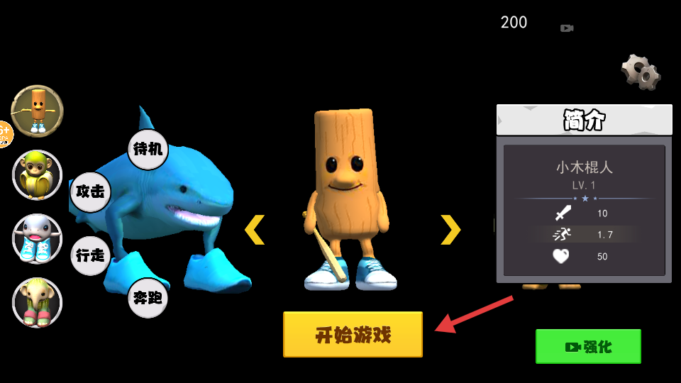 2、查看角色简介(如小木棍人属性),点击【开始游戏】,熟悉角色技能(攻击、行走、奔跑等),提升操作熟练度。