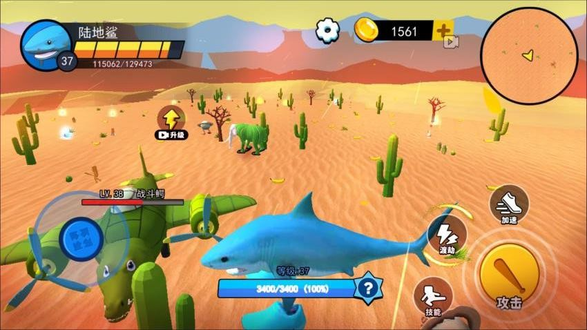 3、在沙漠场景中,操控角色(如陆地鲨),利用【攻击】技能击败敌人(如战斗鳄),收集金币(1561),升级角色(等级+57),解锁新技能和区域。