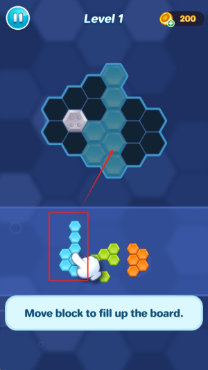 1、移动拼块:将下方的六边形拼块拖动到上方的板子上,填满空白区域。