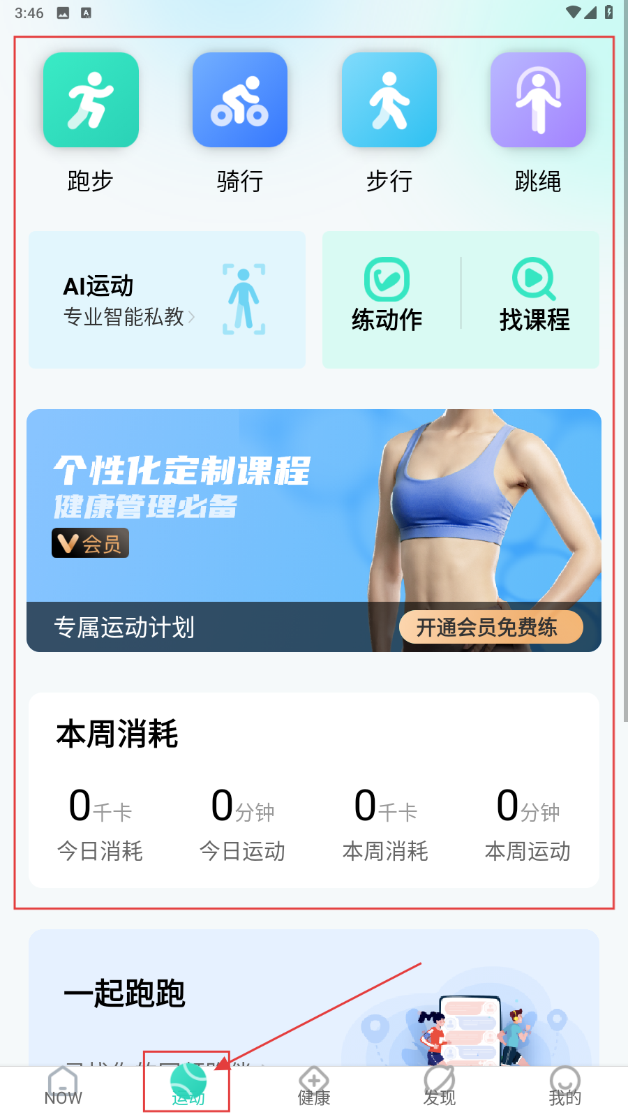 2、切换到【运动】界面,点击运动类型(跑步、骑行等)或课程(个性化定制课程),开启运动计划操作。