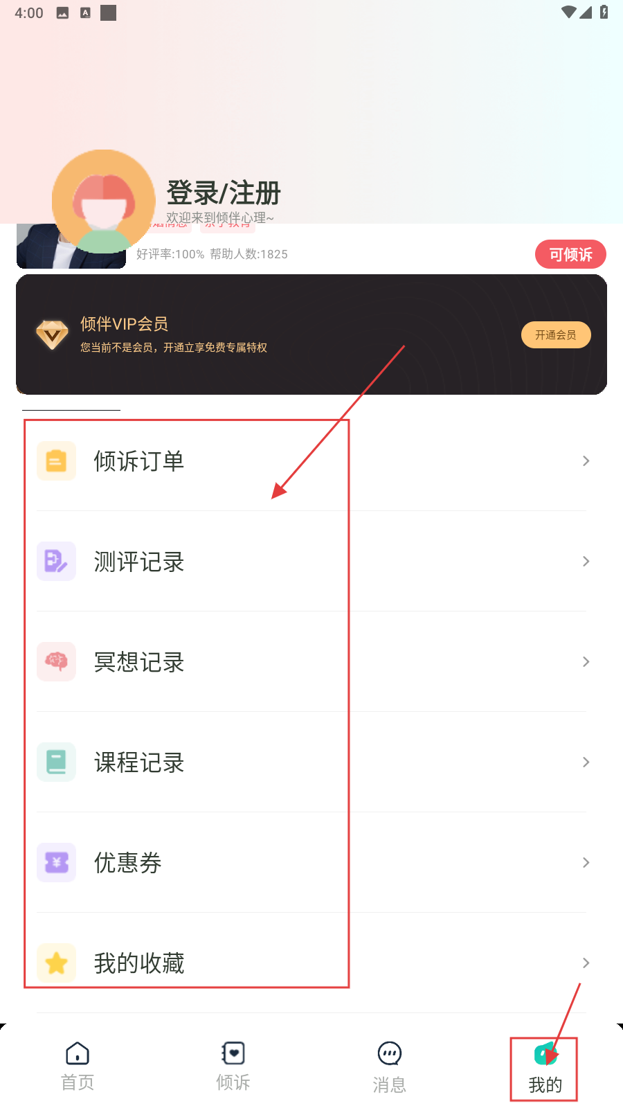 2、切换到【倾诉】界面,点击倾听师列表,开启倾诉流程操作。