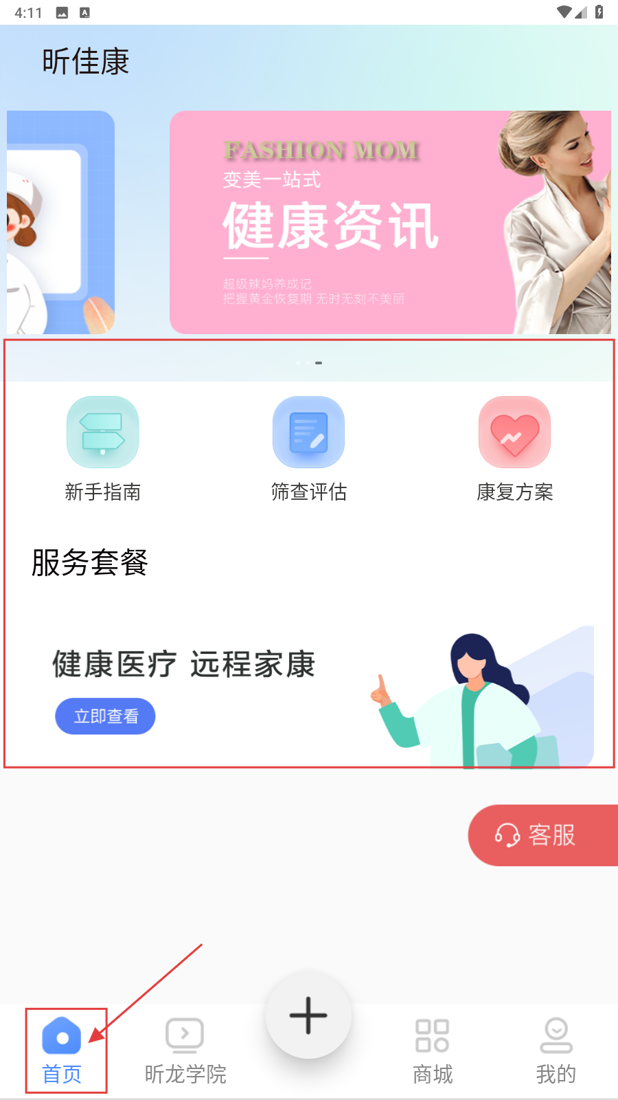 1、打开应用,在【首页】点击功能区(新手指南、筛查评估等),进入健康服务选择操作环节。