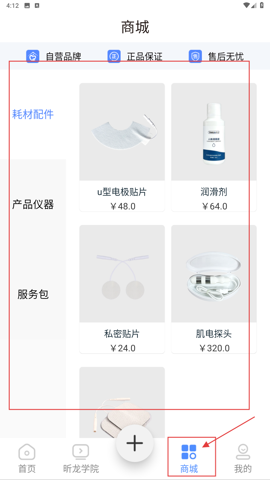 2、切换到【商城】界面,点击商品分类(耗材配件、产品仪器等)及商品(u型电极贴片、润滑剂等),开启购物操作。