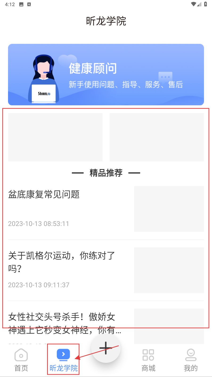 3、进入【昕龙学院】板块,点击查看精品推荐内容(盆底康复问题、凯格尔运动等),进行健康知识学习。