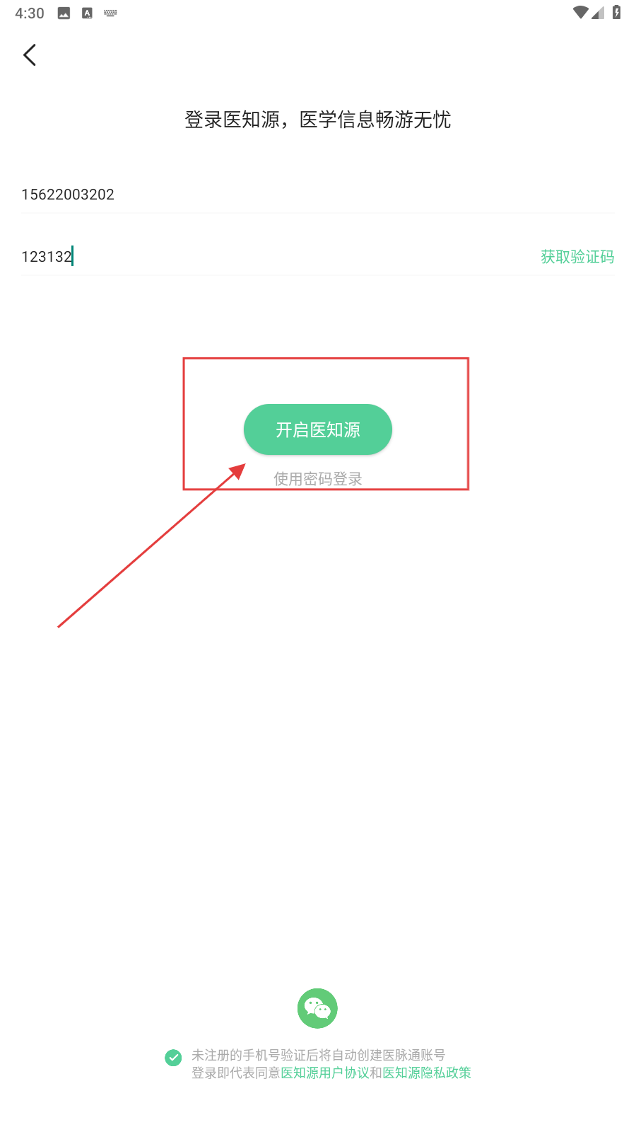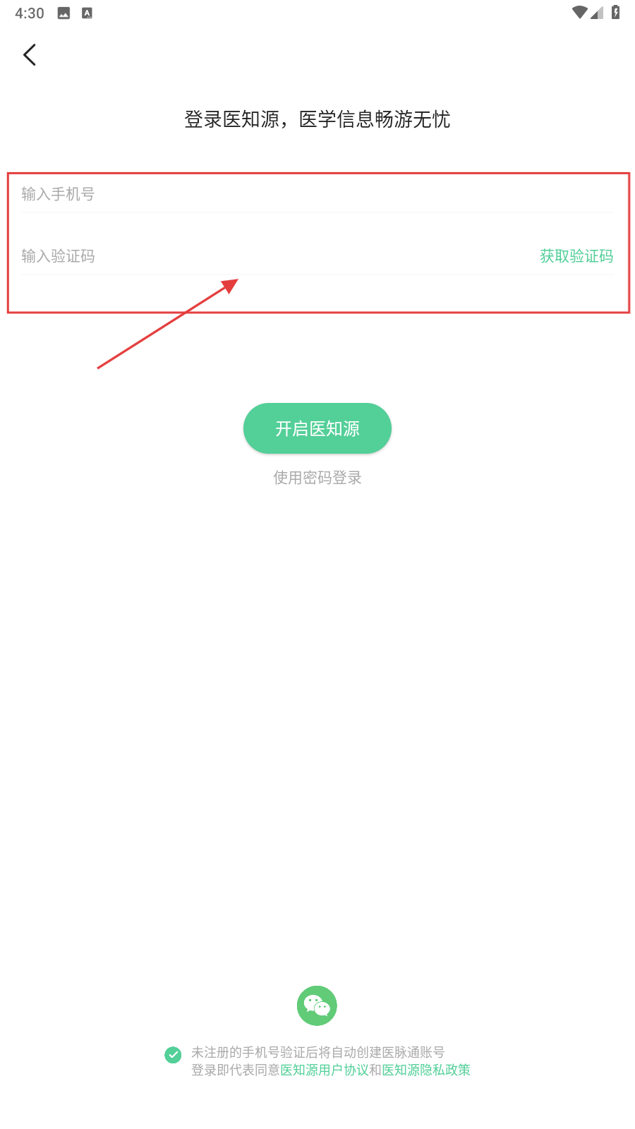 2、在登录界面,点击输入手机号与验证码(按提示操作),完成信息填写。
