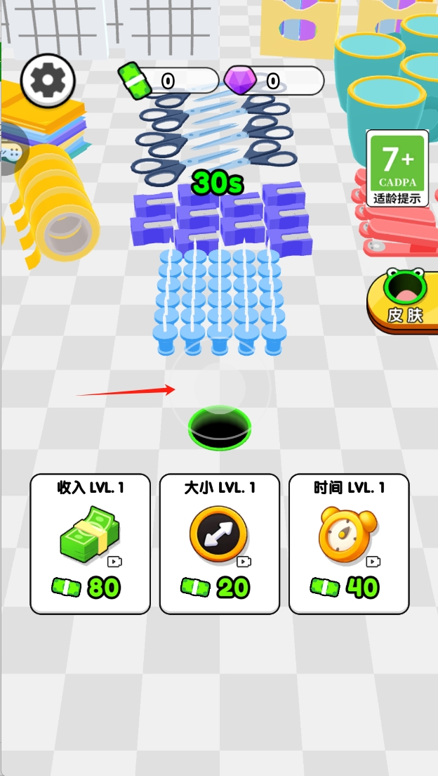 1、基础玩法是移动黑洞靠近物体进行吞噬。体积越大能吞噬的物品就会越多。
