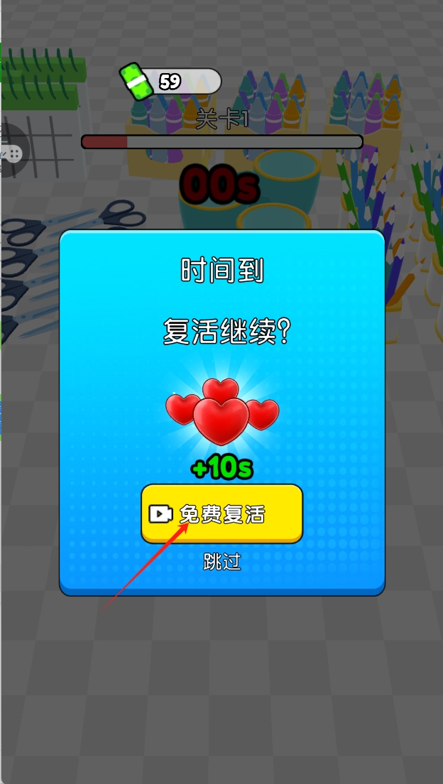 2、游戏时间结束后,可选择“免费复活”继续游戏,或点击“跳过”重新开始,积累经验提升技巧。