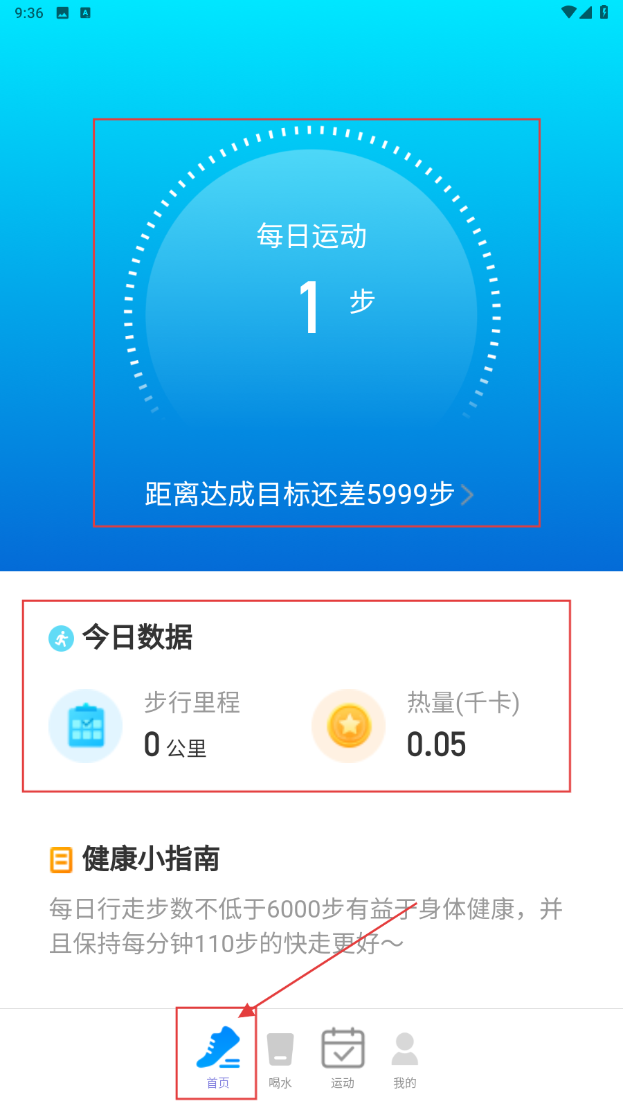 1、打开应用,在【首页】查看每日运动步数、今日数据(步行里程、热量),进入健康数据浏览操作环节。