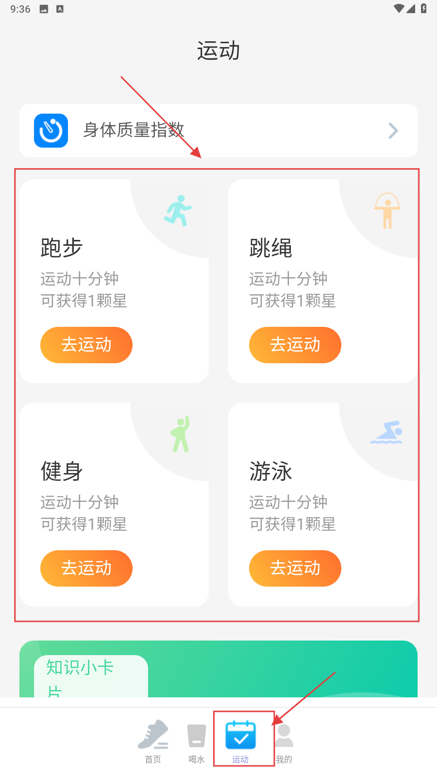 3、进入【运动】板块,点击选择运动项目(跑步、跳绳等),点击【去运动】,完成运动计划选择任务。