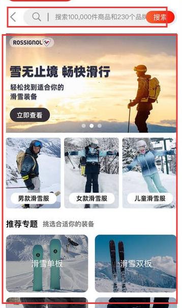 3、进入【滑雪频道】板块,点击查看滑雪装备(雪服、雪板)及推荐专题,完成运动装备浏览任务。