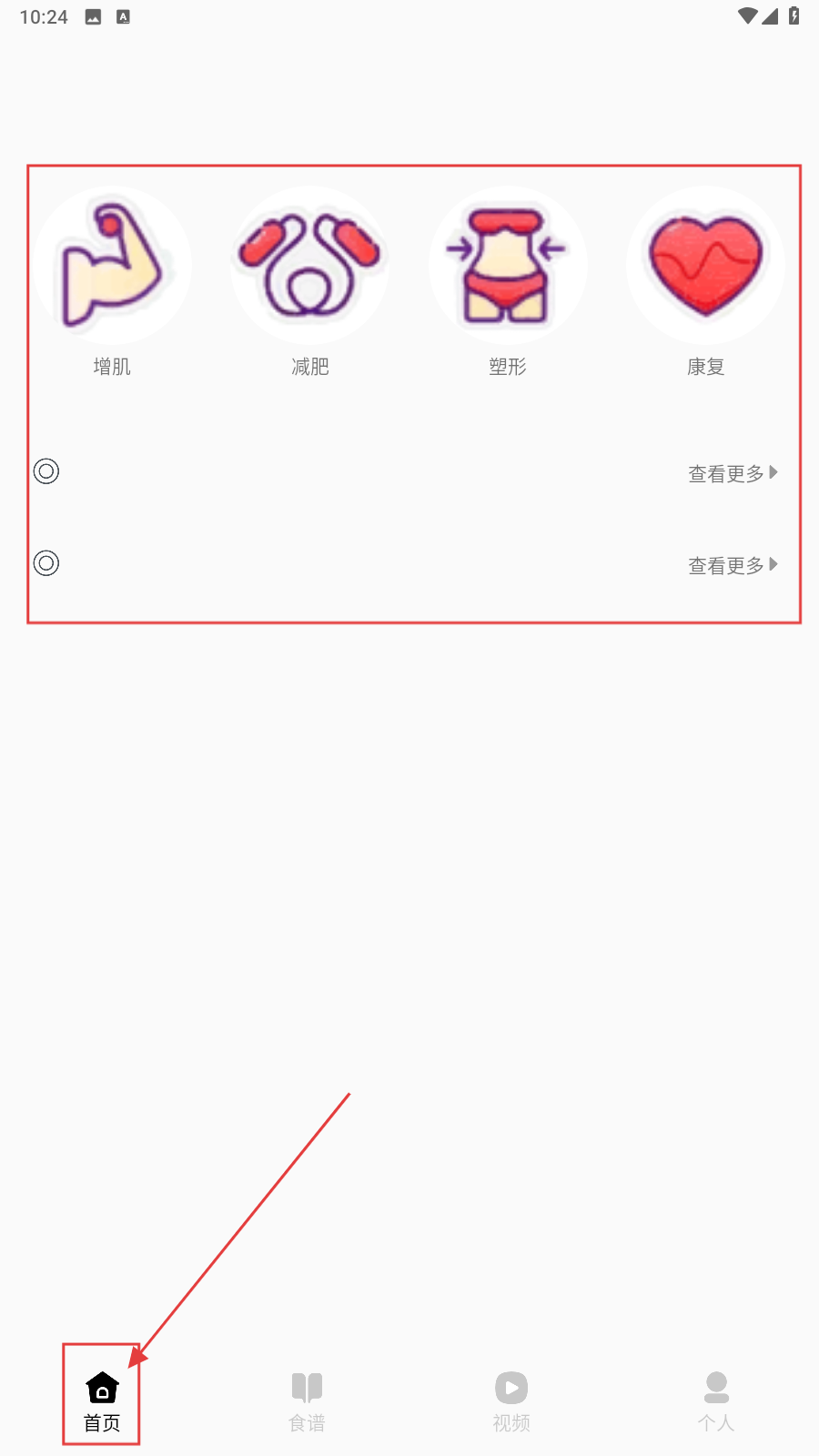 1、打开应用,在【首页】点击健身目标(增肌、减肥等),进入健身计划选择操作环节。