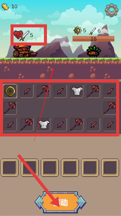 2、在装备栏选武器(如斧头)、防具,点击【动】出发,注意左上角血量(心形图标)和武器攻击值。