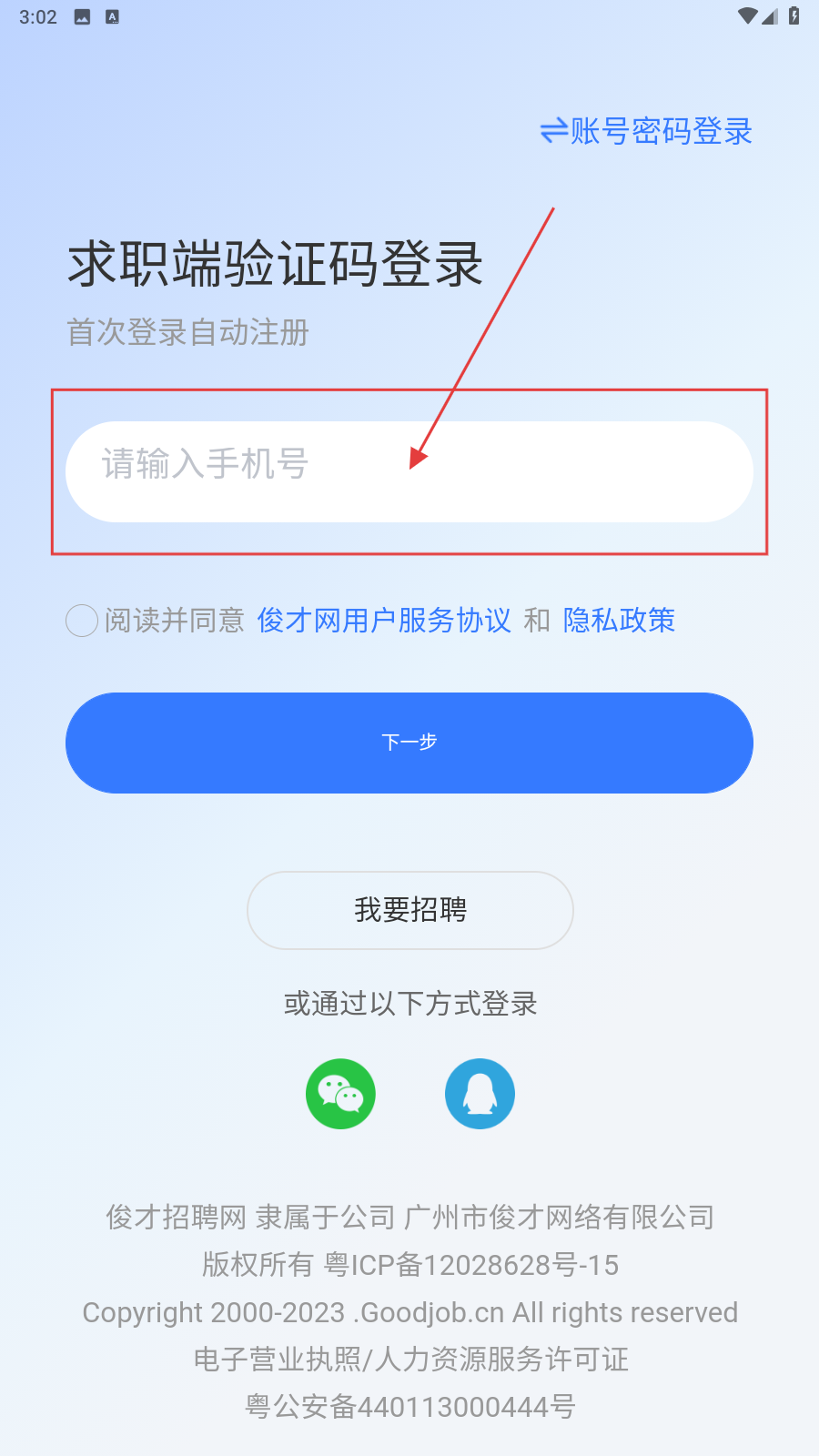 1、打开应用,在【求职端验证码登录】页点击【请输入手机号】框,录入手机号。
