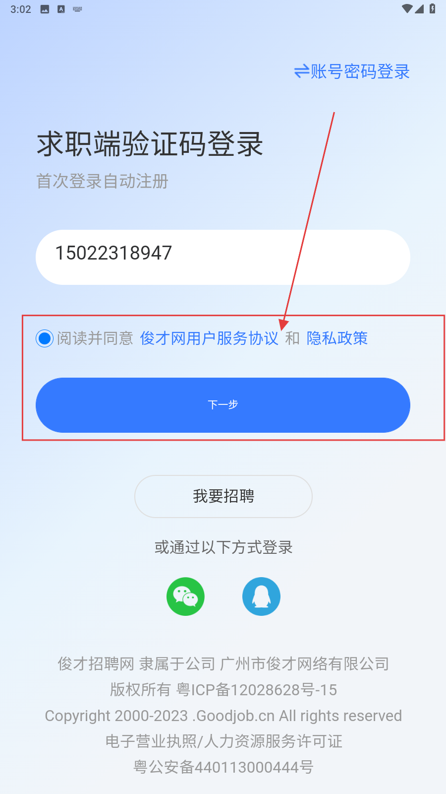 2、勾选协议,点击【下一步】,跳转至验证码页。