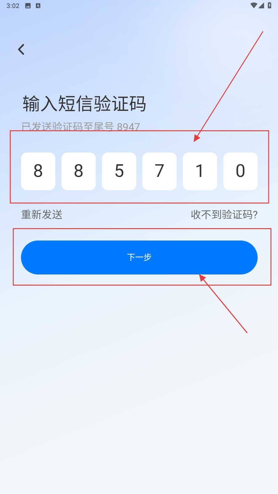 3、在【输入短信验证码】页,输入验证码,点击【下一步】,完成验证。