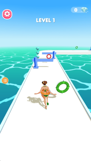 2、躲避赛道障碍:滑动屏幕控制角色左右移动、上下跳跃,灵活避开游泳圈、旋转障碍物。
