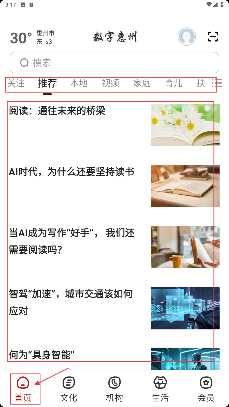 1、打开应用,在【首页】浏览推荐内容,点击【文化】进入文化页。