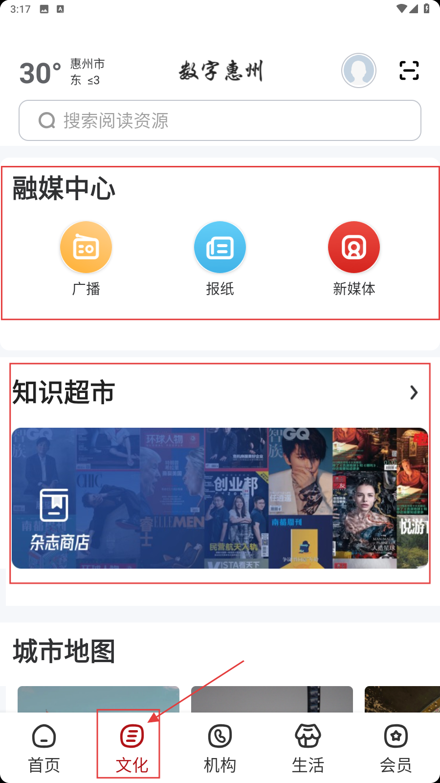 2、在【文化】页查看融媒中心(广播、报纸等)、知识超市(杂志商店等)内容,点击【生活】进入生活页。