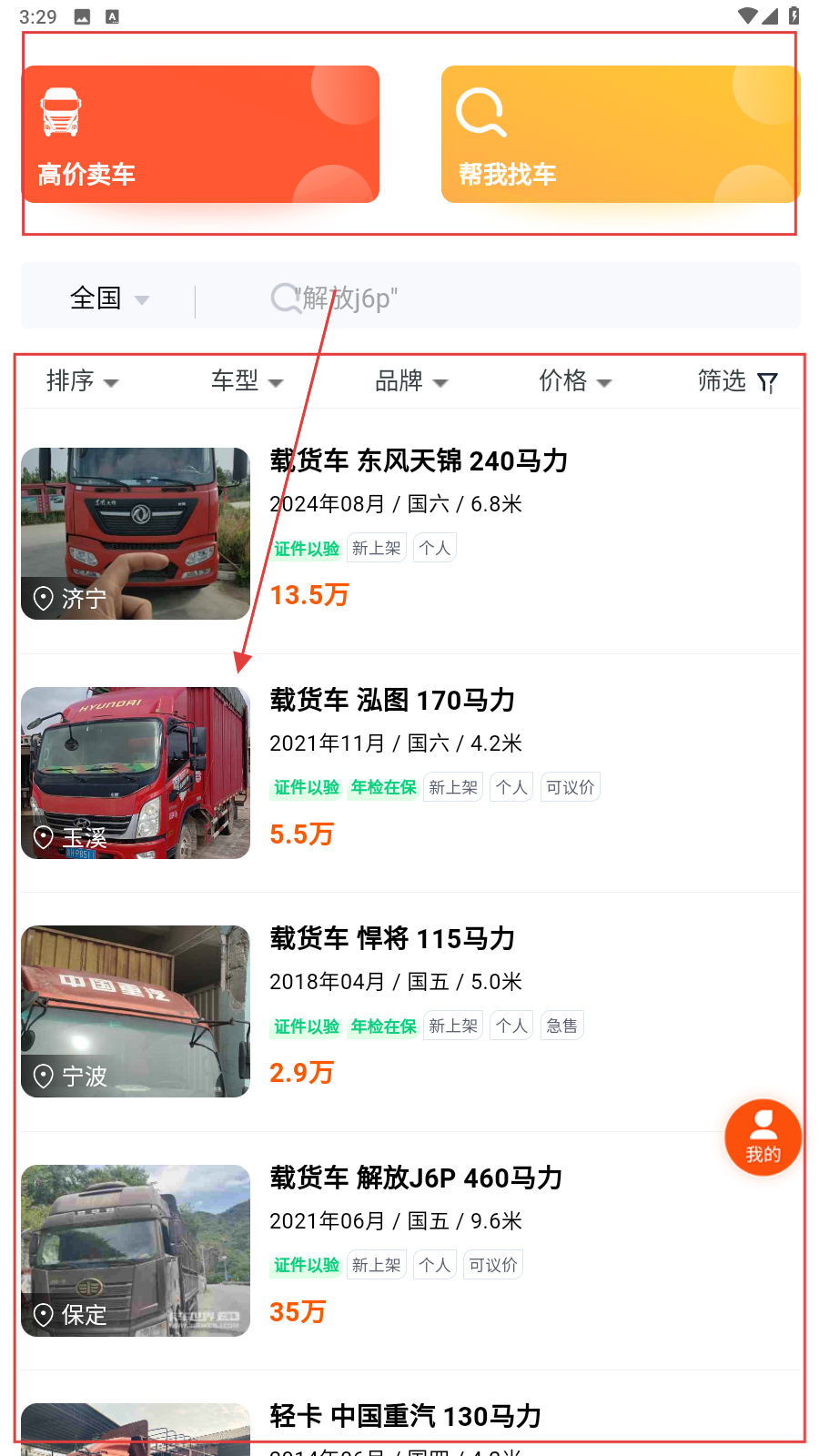 1、打开应用,在首页选【帮我找车】,筛选车型(载货车等),找到目标车源。