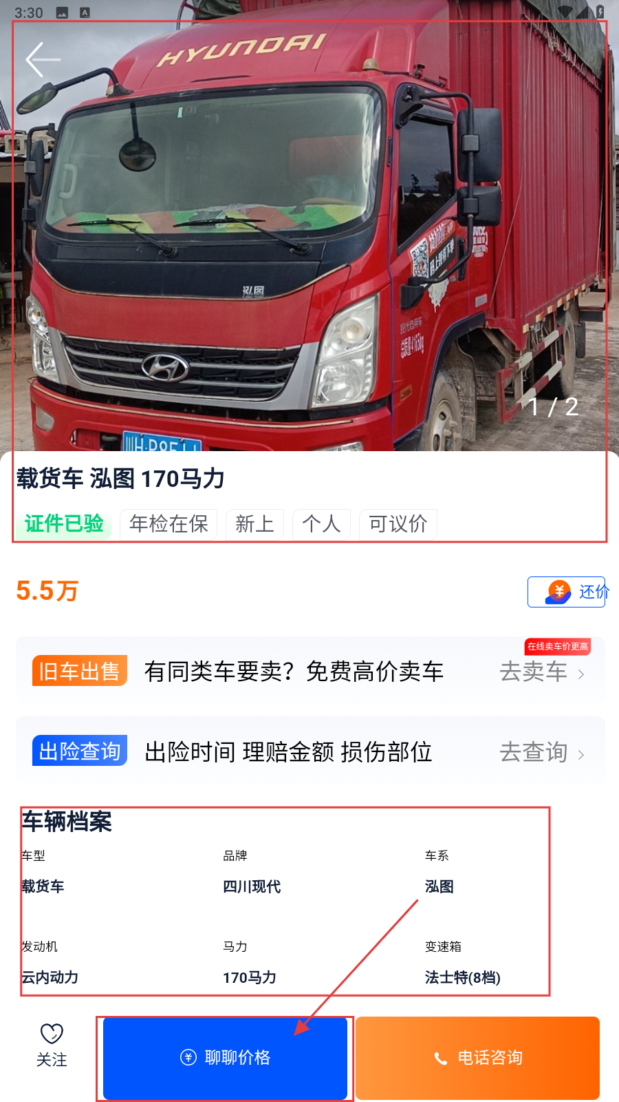 2、进入车辆详情页,查看档案(品牌、马力等),点击【聊聊价格】。
