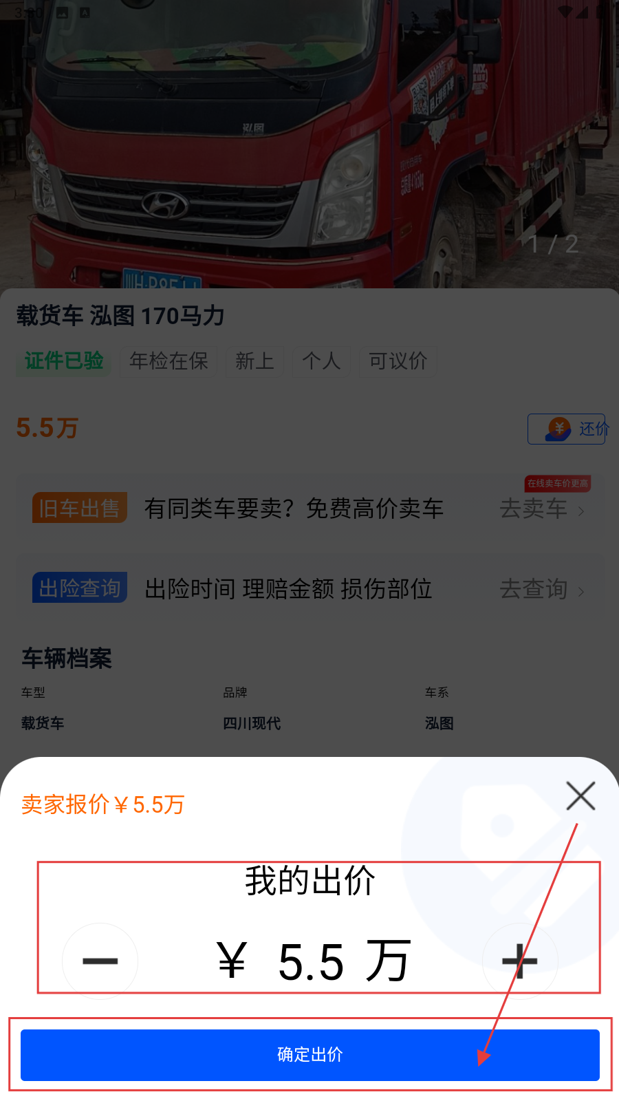 3、在出价弹窗,设置价格(如5.5万),点击【确定出价】,完成购车议价流程。