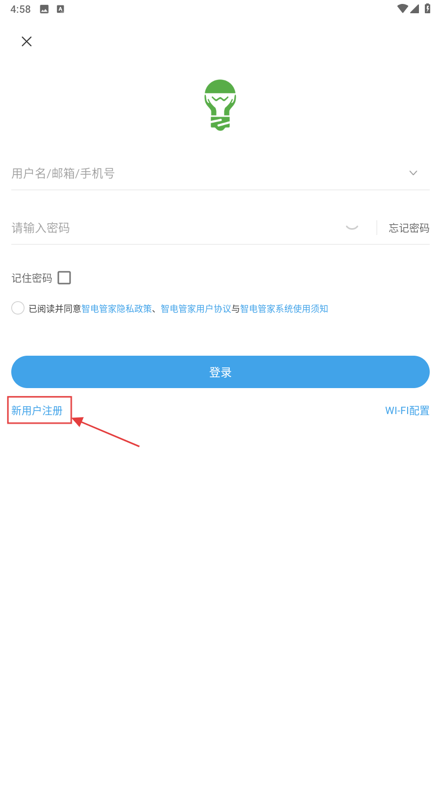 1、打开应用登录页,点击【新用户注册】,进入注册页。