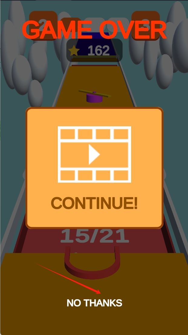 3、当游戏结束时,点击“NO THANKS”按钮,选择不继续游戏,重新开始新的挑战。