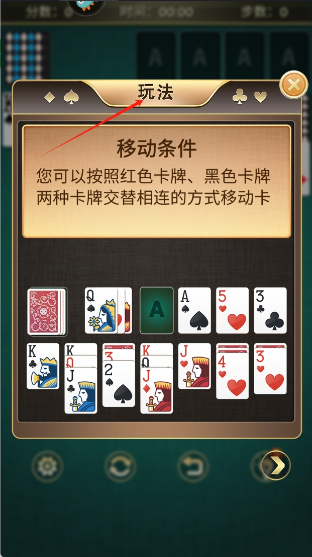 1、点击“玩法”按钮,了解游戏的基本规则,按照红色和黑色交替连接的方式移动纸牌。