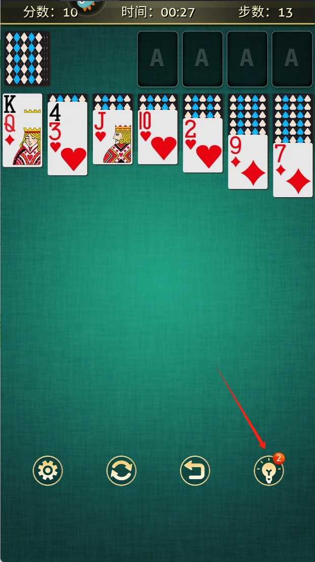 2、游戏界面上方显示分数、时间和步数,下方是纸牌布局和操作按钮,便于进行游戏操作。