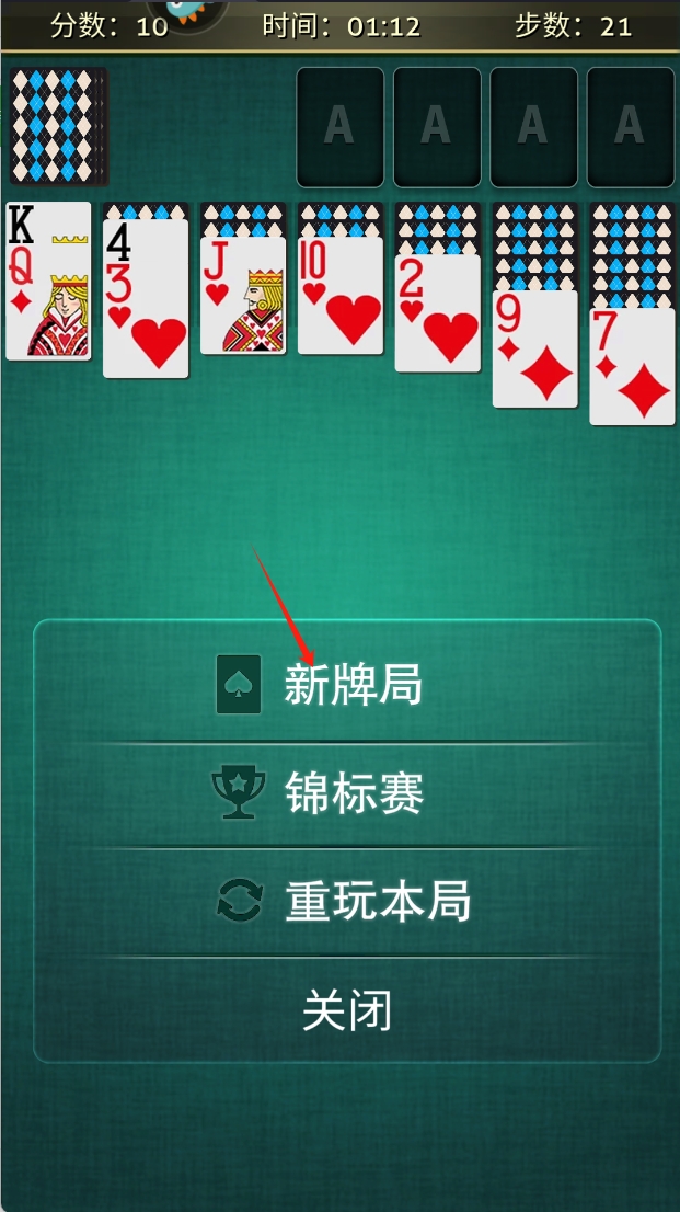 3、点击“新牌局”按钮,开始新的游戏,或选择“锦标赛”、“重玩本局”和“关闭”进行其他操作。