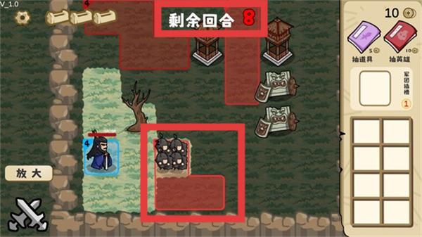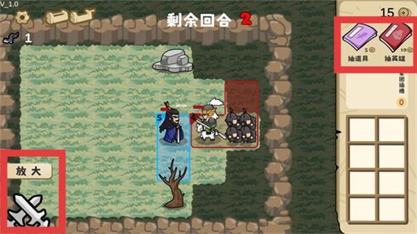 1、进入战斗场景,关注“剩余回合”,合理规划每回合行动,利用“放大”功能观察战场。