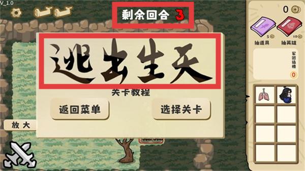 3、完成关卡教程“逃出生天”后,按需选择【返回菜单】整理资源或【选择关卡】开启新挑战。