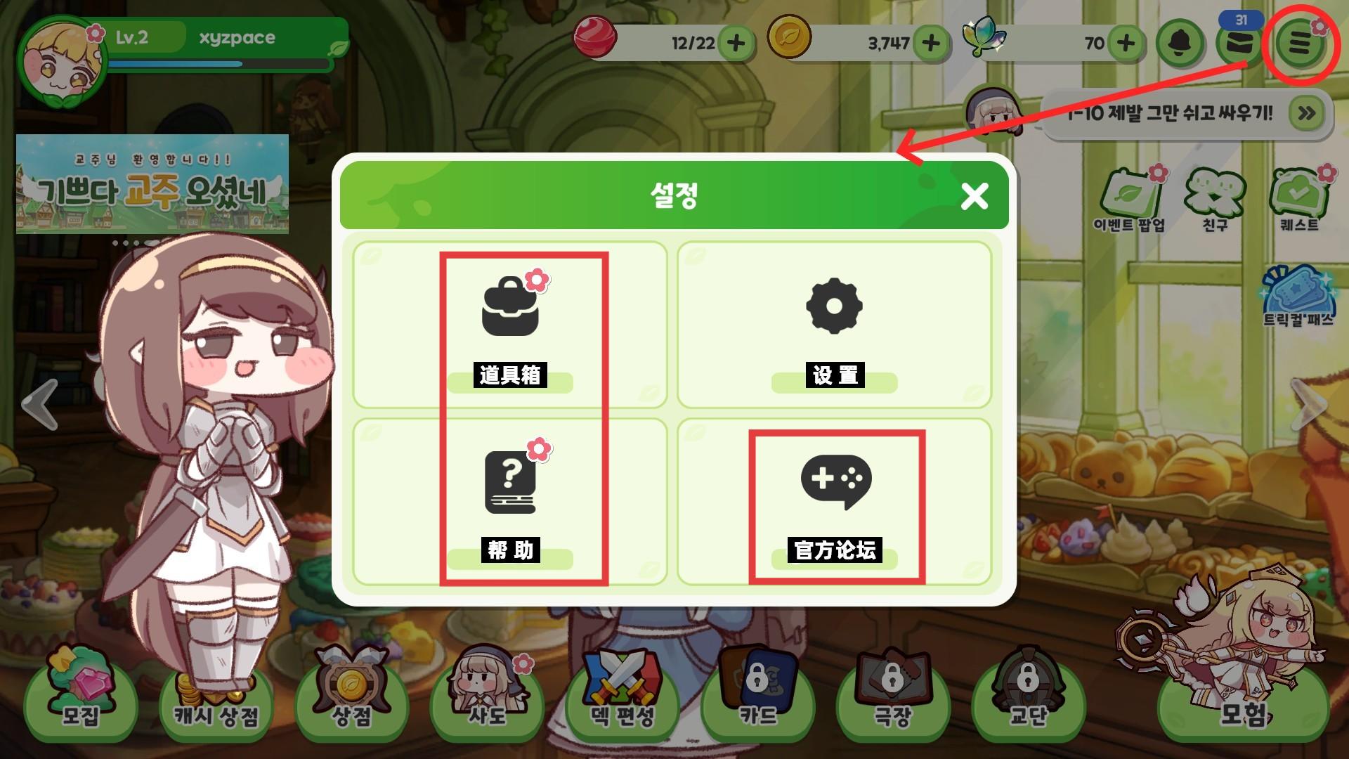 2、点击右上角菜单,了解道具箱、设置等功能,遇到问题可通过【帮助】或【官方论坛】寻求支持。