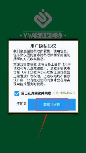 1、同意隐私协议:点击“同意并继续”按钮,接受用户隐私协议,以便开始游戏。