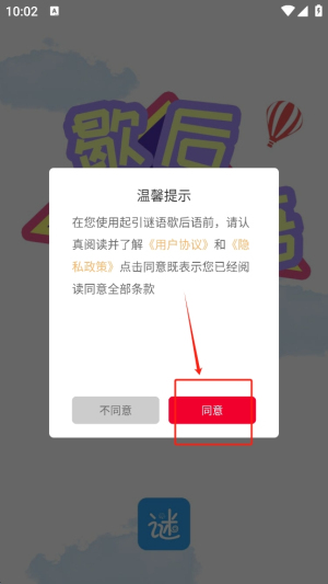 1、同意用户协议:在开始使用谜语游戏前,点击“同意”按钮,表示您已经阅读并同意《用户协议》和《隐私政策》。