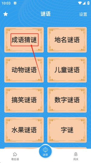 2、选择谜语类型:在谜语主界面,点击您感兴趣的谜语类别,例如“成语猜谜”,进入该类别的谜语列表。
